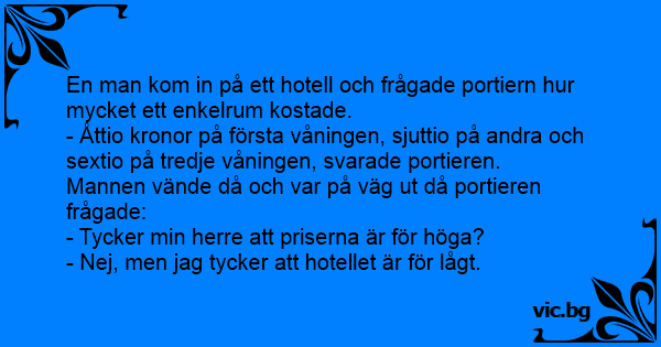 - Ile kosztuje nocleg w tym hotelu? - Na pierwszym piętrze 500 zł, na drugim 200, a na trzecim 100 zł. - To poproszę pokój na trzecim piętrze. - Przykro nam, nasz hotel jest jedno piętrowy.