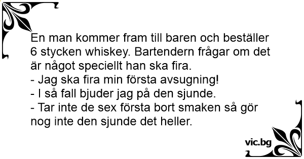 Komt een man een bar binnen. De barman vraagt wat hij wilt drinken. Zegt de man: 'Doe maar 7 glaasjes Whiskey' Barman: 'Vier je soms iets?' Zegt de man: 'Ja, mijn eerste pijpbeurt!' 'O' zegt de...