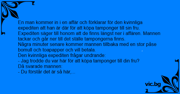 En man kommer in i en affär och förklarar för den kvinnliga expediten att han är där för att köpa tamponger till sin fru. Expediten säger till honom att de finns längst ner i affären. Mannen tackar och går ner till det ställe tampongerna finns.