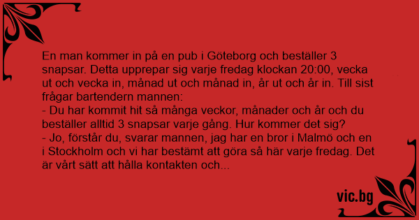 En man kommer in på en pub i Göteborg och beställer 3 snapsar. Detta upprepar sig varje fredag klockan 20:00, vecka ut och vecka in, månad ut och månad in, år ut och år in. Till sist frågar bartendern mannen: