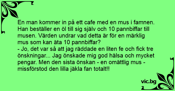 En man kommer in på ett cafe med en mus i famnen. Han beställer en öl till sig själv och 10 pannbiffar till musen. Värden undrar vad detta är för en märklig mus som kan äta 10 pannbiffar?