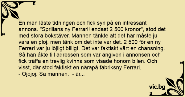 En man läste tidningen och fiск syn på en intressant annons. "Sprillans ny Ferrari! endast 2 500 kronor", stod det med stora bokstäver. Mannen tänkte att det här måste ju vara en ploj, men tänk om det inte var det. 2 500 för en ny Ferrari var ju löjligt billigt. Det var faktiskt värt en chansning. Så han åkte till adressen som var angiven i annonsen och fiск träffa en trevlig kvinna som visade honom bilen. Och visst, där stod faktiskt en närapå fabriksny Ferrari.