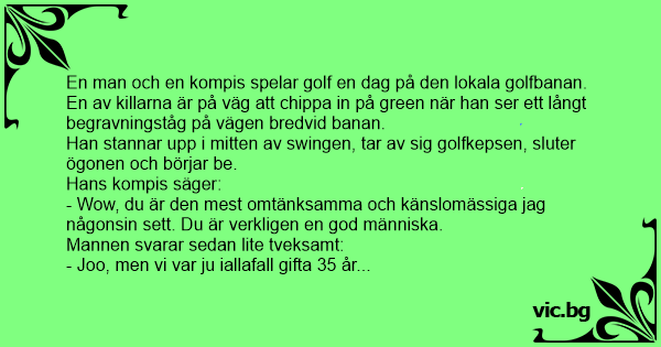 To mannfolk står og spiller golf, og den ene skal til å slå ballen i hullet, da han ser et begravelsesopptog. Han tar da av seg sin hatt og bøyer hodet. Hans kammerat sier overrasket: - Jeg viste...