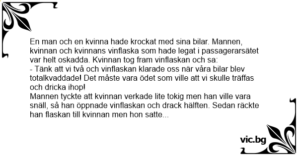 En man och en kvinna hade krockat med sina bilar. Mannen, kvinnan och kvinnans vinflaska som hade legat i passagerarsätet var helt oskadda. Kvinnan tog fram vinflaskan och sa: