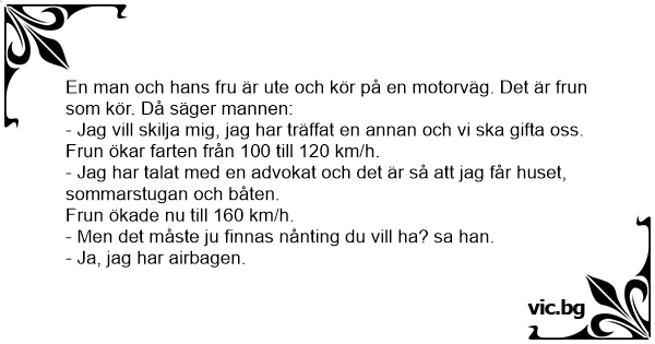 En man och hans fru är ute och kör på en motorväg. Det är frun som kör. Då säger mannen: