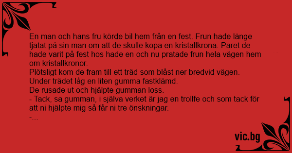 En man och hans fru körde bil hem från en fest. Frun hade länge tjatat på sin man om att de skulle köpa en kristallkrona. Paret de hade varit på fest hos hade en och nu pratade frun hela vägen hem om kristallkronor.