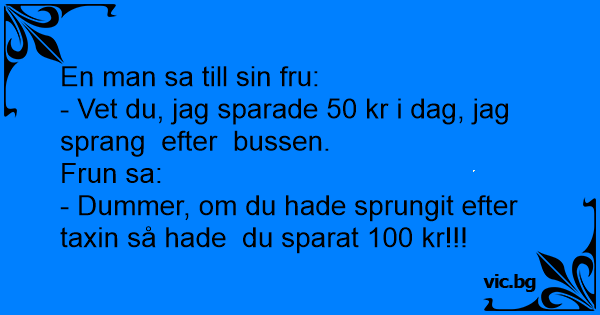 En mand kommer glad hjem til sin kone og siger "jeg har lige sparet 20 ,-. på at løbe efter bussen". Konen siger "kunne du ikke løbe efter en taxa istedet så kunne vi havet sparet en 50,-
