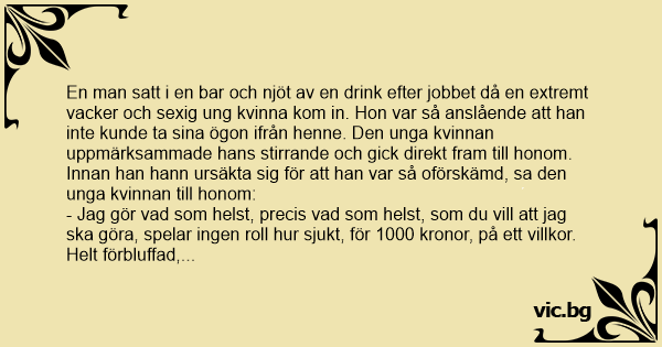 En man satt i en bar och njöt av en drink efter jobbet då en extremt vacker och sexig ung kvinna kom in. Hon var så anslående att han inte kunde ta sina ögon ifrån henne. Den unga kvinnan uppmärksammade hans stirrande och gick direkt fram till honom. Innan han hann ursäkta sig för att han var så oförskämd, sa den unga kvinnan till honom: