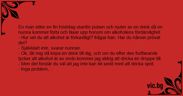 En man sitter en fin höstdag utanför puben och njuter av en drink då en nunna kommer förbi och läxar upp honom om alkoholens fördärvlighet.