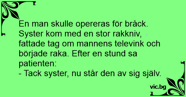 En man skulle opereras för bråck. Syster kom med en stor rakkniv, fattade tag om mannens televink och började raka. Efter en stund sa patienten: