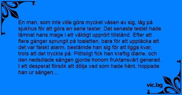 En man, som inte ville göra mycket väsen av sig, låg på sjukhus för att göra en serie tester. Det senaste testet hade lämnat hans mage i ett väldigt upprört tillstånd. Efter att flera gånger sprungit på toaletten, bara för att upptäcka att det var falskt alarm, bestämde han sig för att ligga kvar, trots att det tryckte på. Plötsligt fiск han kraftig diarre, och den nedsölade sängen gjorde honom fruktansvärt generad. I ett desperat försök att dölja vad som hade hänt, hoppade han ur sängen, samlade ihop lakanen och kastade ut dem genom fönstret. Ett fyllo var på väg förbi sjukhuset, då lakanen landade på honom. Han började skrika och svära, och svängde ursinnigt med armarna för att få bort dem, och slutligen landade de i en hög runt fötterna på honom. Medan fyllot stod där, lite ostadig på fötterna, och stirrade ner på lakanen, kom en säkerhetsvakt (som knappt kunde hålla sig för skratt). Han hade sett hela incidenten, och frågade: