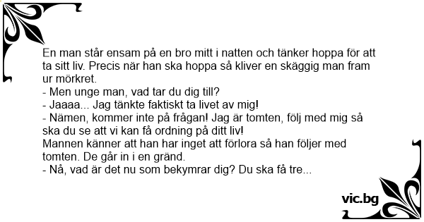 - Nå, vad är det nu som bekymrar dig? Du ska få tre önskningar så kanske saker ordnar sig för dig. Vad vill du önska dig.