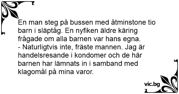 - Naturligtvis inte, fräste mannen. Jag är handelsresande i kondomer och de här barnen har lämnats in i samband med klagomål på mina varor.