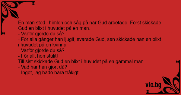 - För alla gånger han ljugit, svarade Gud, sen skickade han en blixt i huvudet på en kvinna.