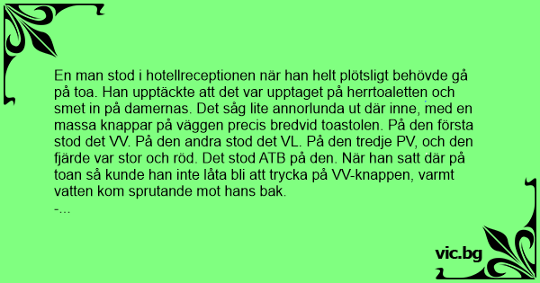 En man stod i hotellreceptionen när han helt plötsligt behövde gå på toa. Han upptäckte att det var upptaget på herrtoaletten och smet in på damernas. Det såg lite annorlunda ut där inne, med en маssа knappar på väggen precis bredvid toastolen. På den första stod det VV. På den andra stod det VL. På den tredje PV, och den fjärde var stor och röd. Det stod ATB på den. När han satt där på toan så kunde han inte låta bli att trycka på VV-knappen, varmt vatten kom sprutande mot hans bak.