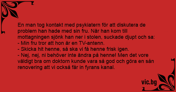 En man tog kontakt med psykiatern för att diskutera de problem han hade med sin fru. När han kom till mottagningen sjönk han ner i stolen, suckade djupt och sa: