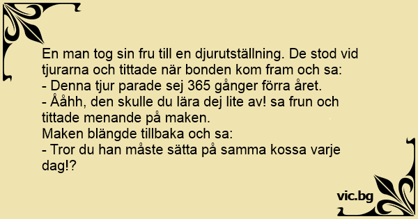 En man tog sin fru till en djurutställning. De stod vid tjurarna och tittade när bonden kom fram och sa: