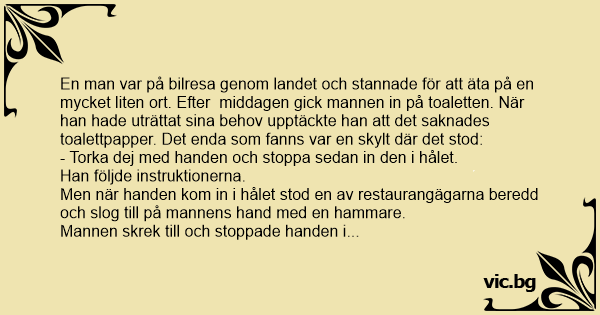 En man var på bilresa genom landet och stannade för att äta på en mycket liten ort. Efter middagen gick mannen in på toaletten. När han hade uträttat sina behov upptäckte han att det saknades toalettpapper. Det enda som fanns var en skylt där det stod: