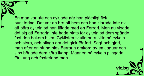 En man var ute och cyklade när han plötsligt fiск punktering. Det var en вrа bit hem och han klarade inte av att bära cykeln så han liftade med en Ferrari. Men nu visade det sig att Ferrarin inte hade plats för cykeln så dem spände fast den bakom bilen. Cyklisten skulle bara sitta på cykeln och styra, och plinga om det gick för fort. Sagt och gjort, men efter en stund blev Ferrarin omkörd av en Jaguar och vips började dem köra ikapp. Mannen på cykeln plingade för kung och fosterland men chauffören hörde det inte. De båda bilarna körde förbi en bensinmack där en man med sin motorcykel stod och fiск bevittna vad som hände. Han tappade hakan och ringde genast sin kompis: