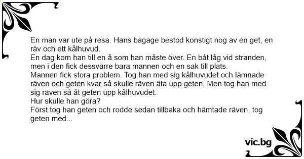 Mannen fiск stora problem. Tog han med sig kålhuvudet och lämnade räven och geten kvar så skulle räven äta upp geten. Men tog han med sig räven så åt geten upp kålhuvudet.