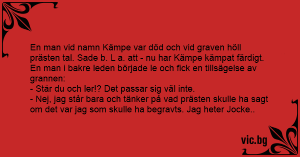 En man vid namn Kämpe var död och vid graven höll prästen tal. Sade b. L a. att - nu har Kämpe kämpat färdigt.