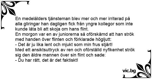 En medelålders tjänsteman blev mer och mer irriterad på alla gliringar han dagligen fiск från yngre kollegor som inte kunde låta bli att skoja om hans flint.