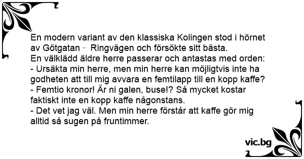 - Ursäkta min herre, men min herre kan möjligtvis inte ha godheten att till mig avvara en femtilapp till en kopp kaffe?