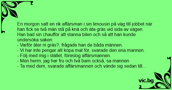 En morgon satt en rik affärsman i sin limousin på väg till jobbet när han fiск se två män stå på knä och äta gräs vid sida av vägen.