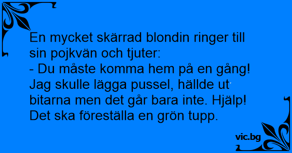 - Du måste komma hem på en gång! Jag skulle lägga pussel, hällde ut bitarna men det går bara inte. Hjälp! Det ska föreställa en grön tupp.