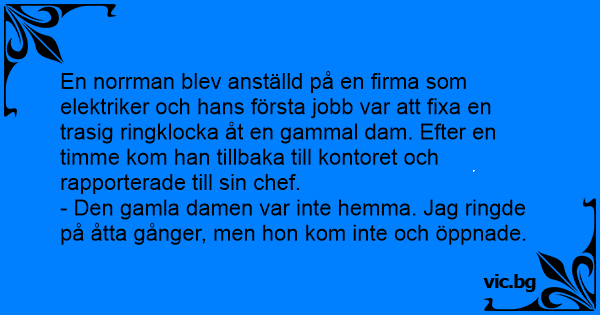 En norrman blev anställd på en firma som elektriker och hans första jobb var att fixa en trasig ringklocka åt en gammal dam. Efter en timme kom han tillbaka till kontoret och rapporterade till sin chef.