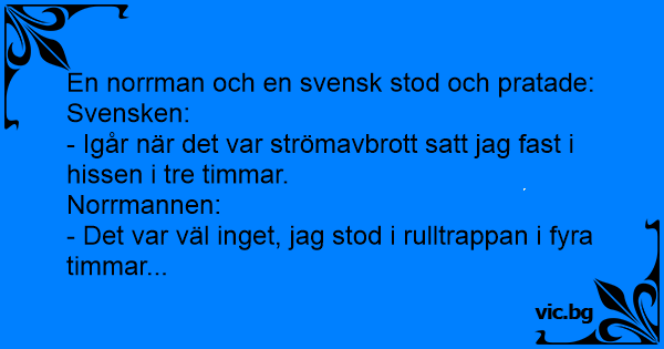 - Da det var strømbrudd forrige uke, ble jeg sittende fast i en heis i tre timer. - Det er vel ingenting, jeg sto fire timer i en rulletrapp!