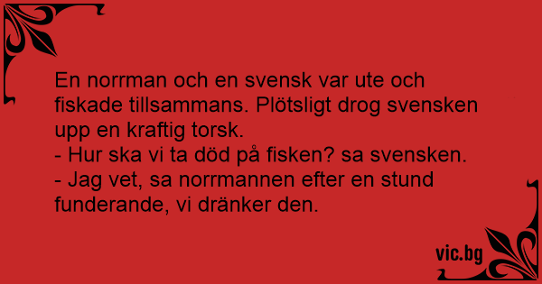 En norrman och en svensk var ute och fiskade tillsammans. Plötsligt drog svensken upp en kraftig torsk.