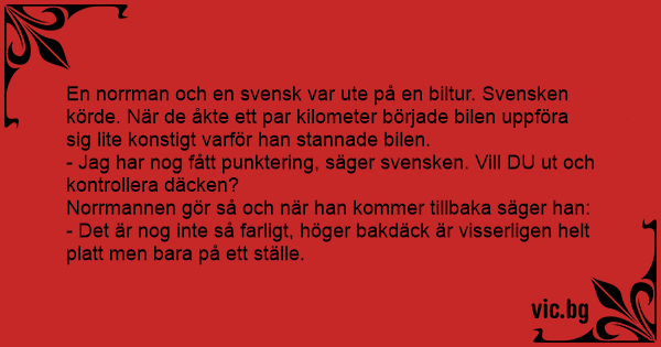 En norrman och en svensk var ute på en biltur. Svensken körde. När de åkte ett par kilometer började bilen uppföra sig lite konstigt varför han stannade bilen.