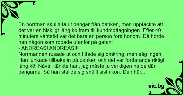 En norrman skulle ta ut pengar från banken, men upptäckte att det var en hiskligt lång kö fram till kundmottagningen. Efter 40 minuters väntetid var det bara en person före honom. Då hörde han någon som ropade utanför på gatan: