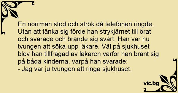 En norrman stod och strök då telefonen ringde. Utan att tänka sig förde han strykjärnet till örat och svarade och brände sig svårt. Han var nu tvungen att söka upp läkare. Väl på sjukhuset blev han tillfrågad av läkaren varför han bränt sig på båda kinderna, varpå han svarade: