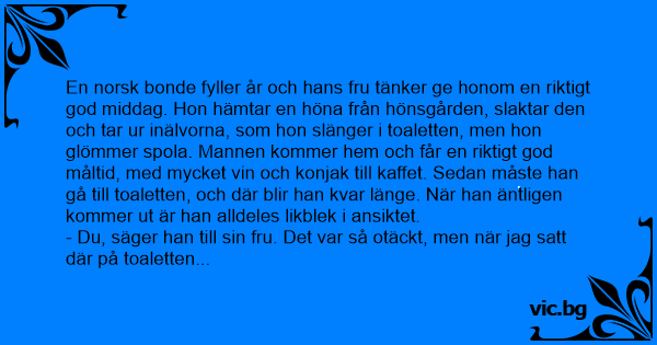 En norsk bonde fyller år och hans fru tänker ge honom en riktigt god middag. Hon hämtar en höna från hönsgården, slaktar den och tar ur inälvorna, som hon slänger i toaletten, men hon glömmer spola. Mannen kommer hem och får en riktigt god måltid, med mycket vin och konjak till kaffet. Sedan måste han gå till toaletten, och där blir han kvar länge. När han äntligen kommer ut är han alldeles likblek i ansiktet.