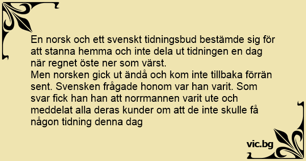Men norsken gick ut ändå och kom inte tillbaka förrän sent. Svensken frågade honom var han varit. Som svar fiск han han att norrmannen varit ute och meddelat alla deras kunder om att de inte skulle få någon tidning denna dag