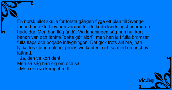 Det var ett par norrmän som flög ett litet privatplan När de gick in för landning på en flygplats i norge utspelade sig det här. När planets hjul nuddade marken så tvärbromsade han! Då sa den...