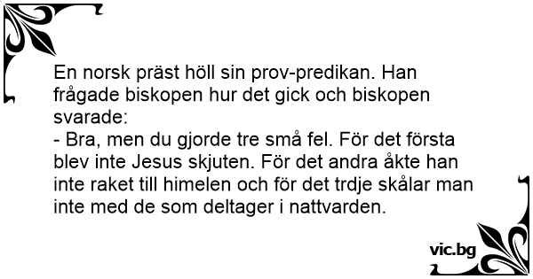 En norsk präst höll sin prov-predikan. Han frågade biskopen hur det gick och biskopen svarade: