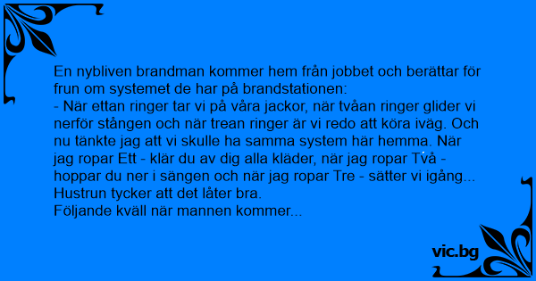 - När ettan ringer tar vi på våra jackor, när tvåan ringer glider vi nerför stången och när trean ringer är vi redo att köra iväg. Och nu tänkte jag att vi skulle ha samma system här hemma. När jag ropar Ett - klär du av dig alla kläder, när jag ropar Två - hoppar du ner i sängen och när jag ropar Tre - sätter vi igång...