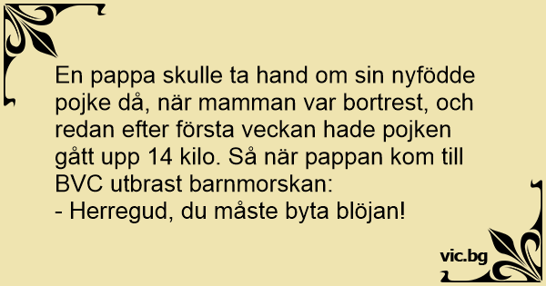 En pappa skulle ta hand om sin nyfödde pojke då, när mamman var bortrest, och redan efter första veckan hade pojken gått upp 14 kilo. Så när pappan kom till BVC utbrast barnmorskan: