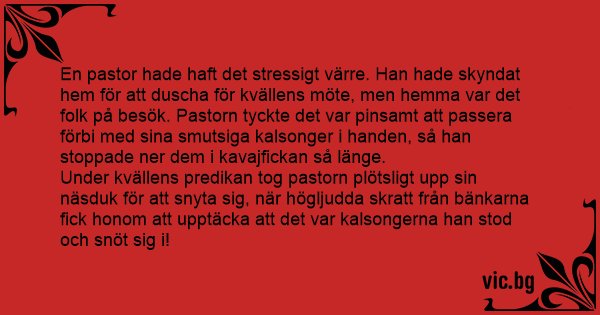 En pastor hade haft det stressigt värre. Han hade skyndat hem för att duscha för kvällens möte, men hemma var det folk på besök. Pastorn tyckte det var pinsamt att passera förbi med sina smutsiga kalsonger i handen, så han stoppade ner dem i kavajfickan så länge.