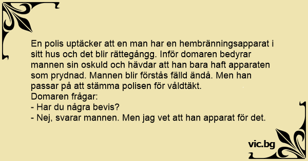 En polis uptäcker att en man har en hembränningsapparat i sitt hus och det blir rättegångg. Inför domaren bedyrar mannen sin oskuld och hävdar att han bara haft apparaten som prydnad. Mannen blir förstås fälld ändå. Men han passar på att stämma polisen för våldtäkt.