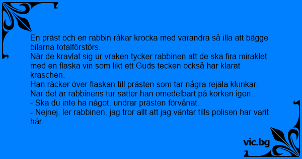 En präst och en rabbin råkar krocka med varandra så illa att bägge bilarna totalförstörs.