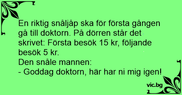 En riktig snåljåp ska för första gången gå till doktorn. På dörren står det skrivet: Första besök 15 kr, följande besök 5 kr.
