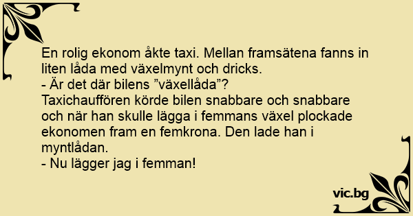 Taxichauffören körde bilen snabbare och snabbare och när han skulle lägga i femmans växel plockade ekonomen fram en femkrona. Den lade han i myntlådan.