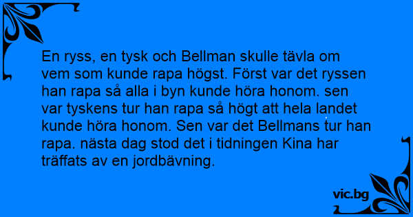 En ryss, en tysk och Bellman skulle tävla om vem som kunde rapa högst. Först var det ryssen han rapa så alla i byn kunde höra honom. sen var tyskens tur han rapa så högt att hela landet kunde höra honom. Sen var det Bellmans tur han rapa. nästa dag stod det i tidningen Kina har träffats av en jordbävning.