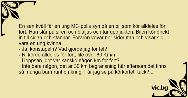 En sen kväll får en ung MC-polis syn på en bil som kör alldeles för fort. Han slår på siren och blåljus och tar upp jakten. Bilen kör direkt in till sidan och stannar. Föraren vevar ner sidorutan och visar sig vara en ung kvinna.