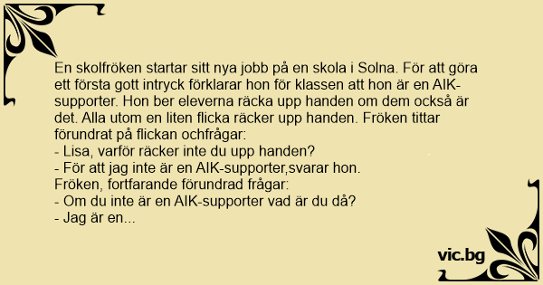En skolfröken startar sitt nya jobb på en skola i Solna. För att göra ett första gott intryck förklarar hon för klassen att hon är en AIK-supporter. Hon ber eleverna räcka upp handen om dem också är det. Alla utom en liten flicka räcker upp handen. Fröken tittar förundrat på flickan ochfrågar: