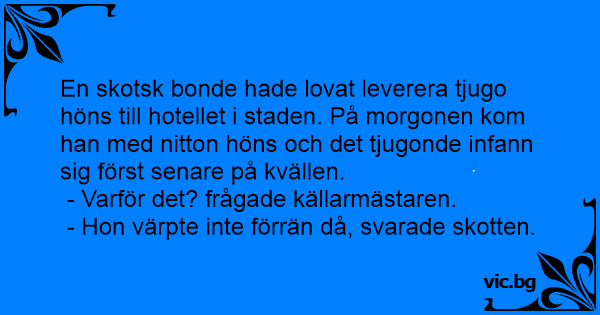 En skotsk bonde hade lovat leverera tjugo höns till hotellet i staden. På morgonen kom han med nitton höns och det tjugonde infann sig först senare på kvällen.